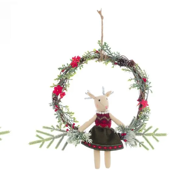 La meravigliosa ghirlanda è realizzata in vimini intrecciato, decorato con rametti, pigne, bacche e fiorellini ed è impreziosita con una tenera cervetta, con un delizioso vestitino.